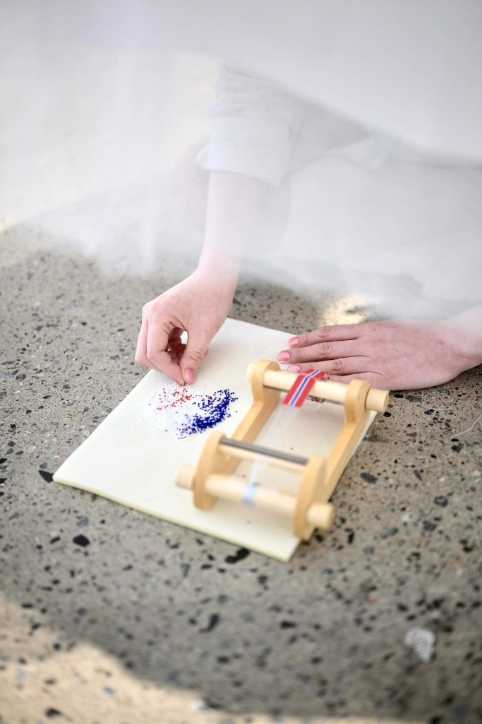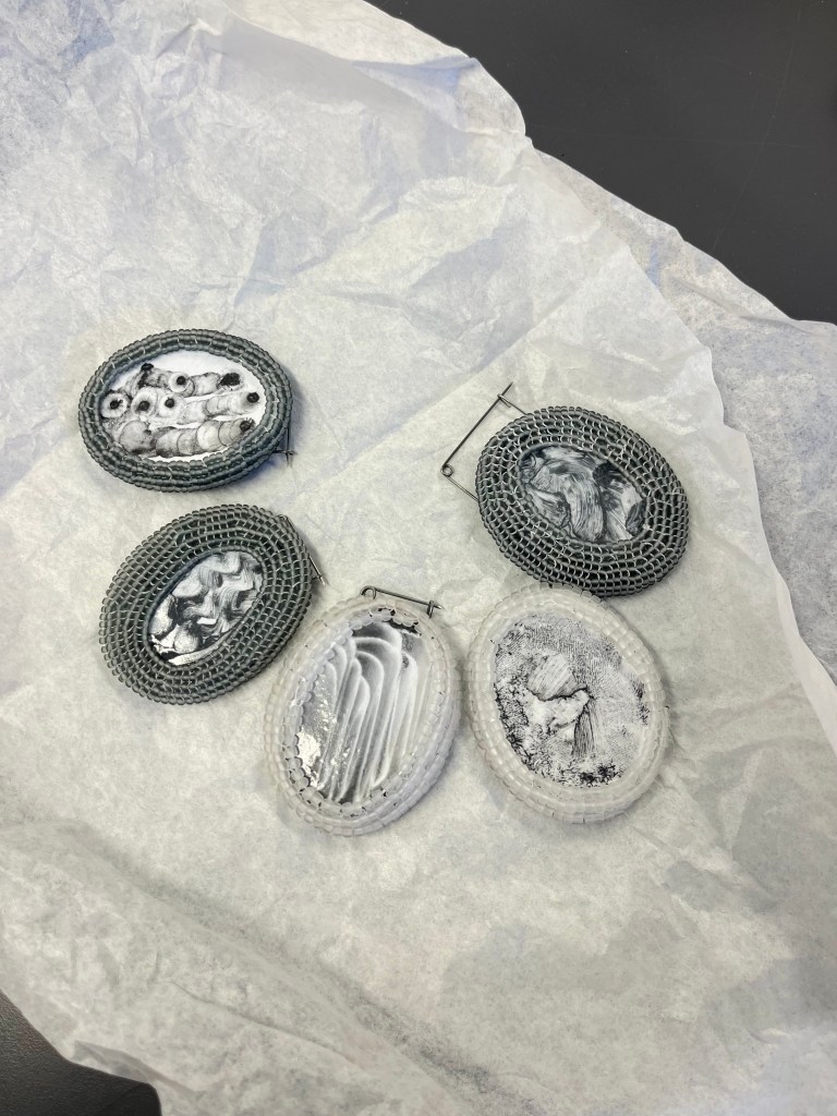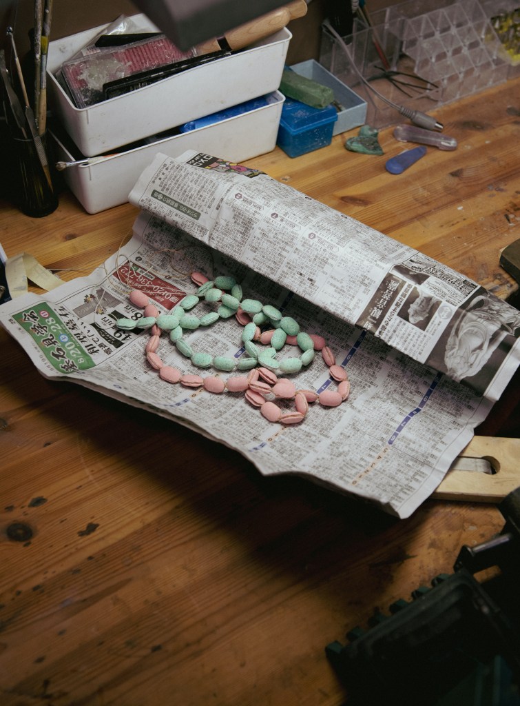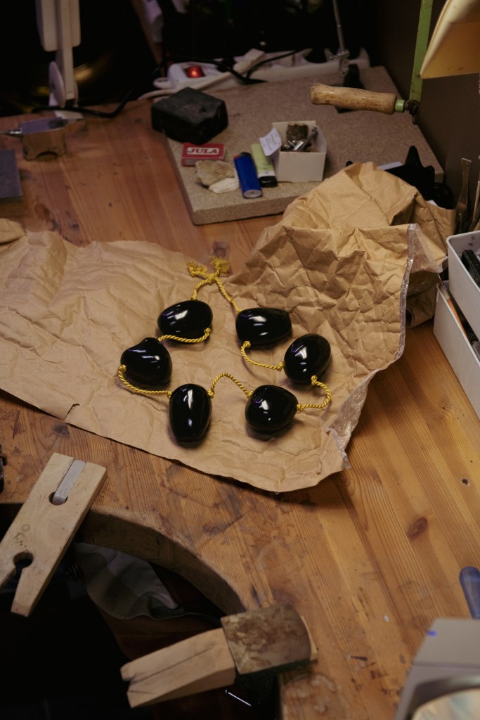 Transportering (2023) Performative Installation Photo by Nanaka AdachiOmoté (2023) Urushi lacquer necklace Photo by Ivar Kvaal for The VesselAlt om oss (2023) Water soluble necklace Photo by Ivar Kvaal for The VesselStopped Clock Illusion (2023) enamel brooch series with glass beads